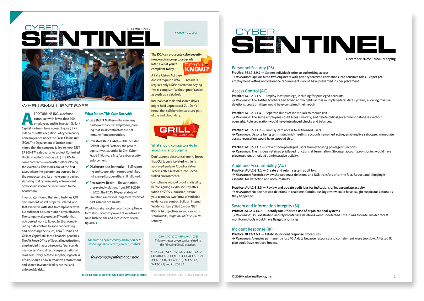 CyberSentinel delivers mission-critical CMMC insights, real-world examples, and actionable guidance tailored for the Defense Industrial Base. It helps organizations stay ahead of evolving requirements and gives contractors the clarity and confidence they need to pass assessments and protect national defense information.